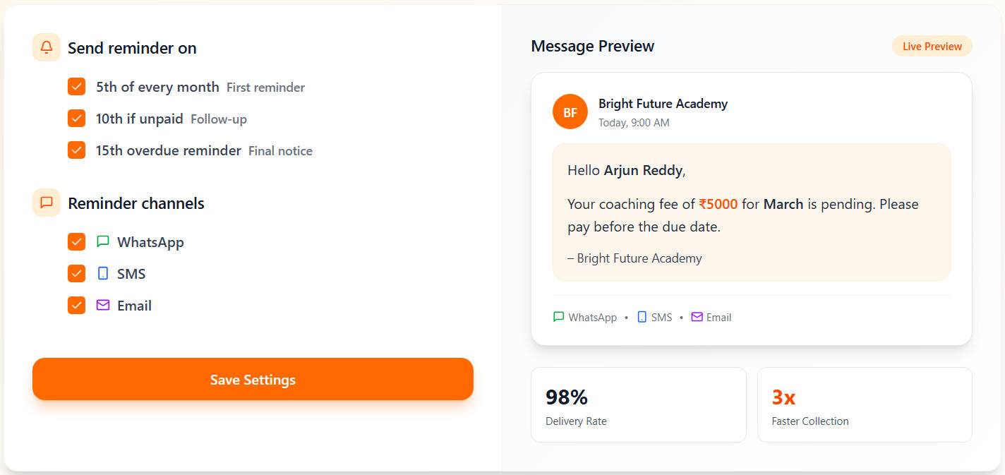 Send reminders before fee due dates so payments are never missed.