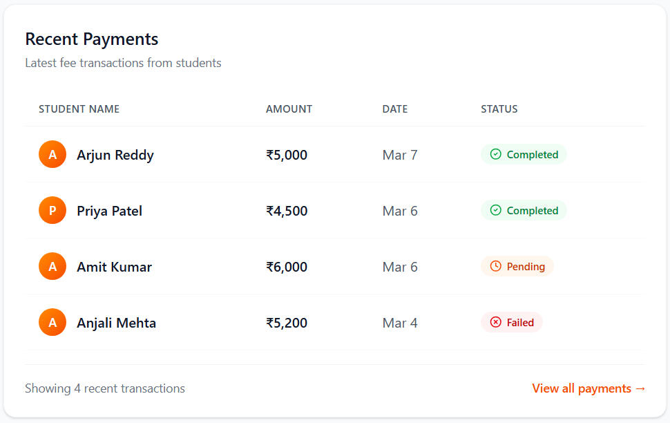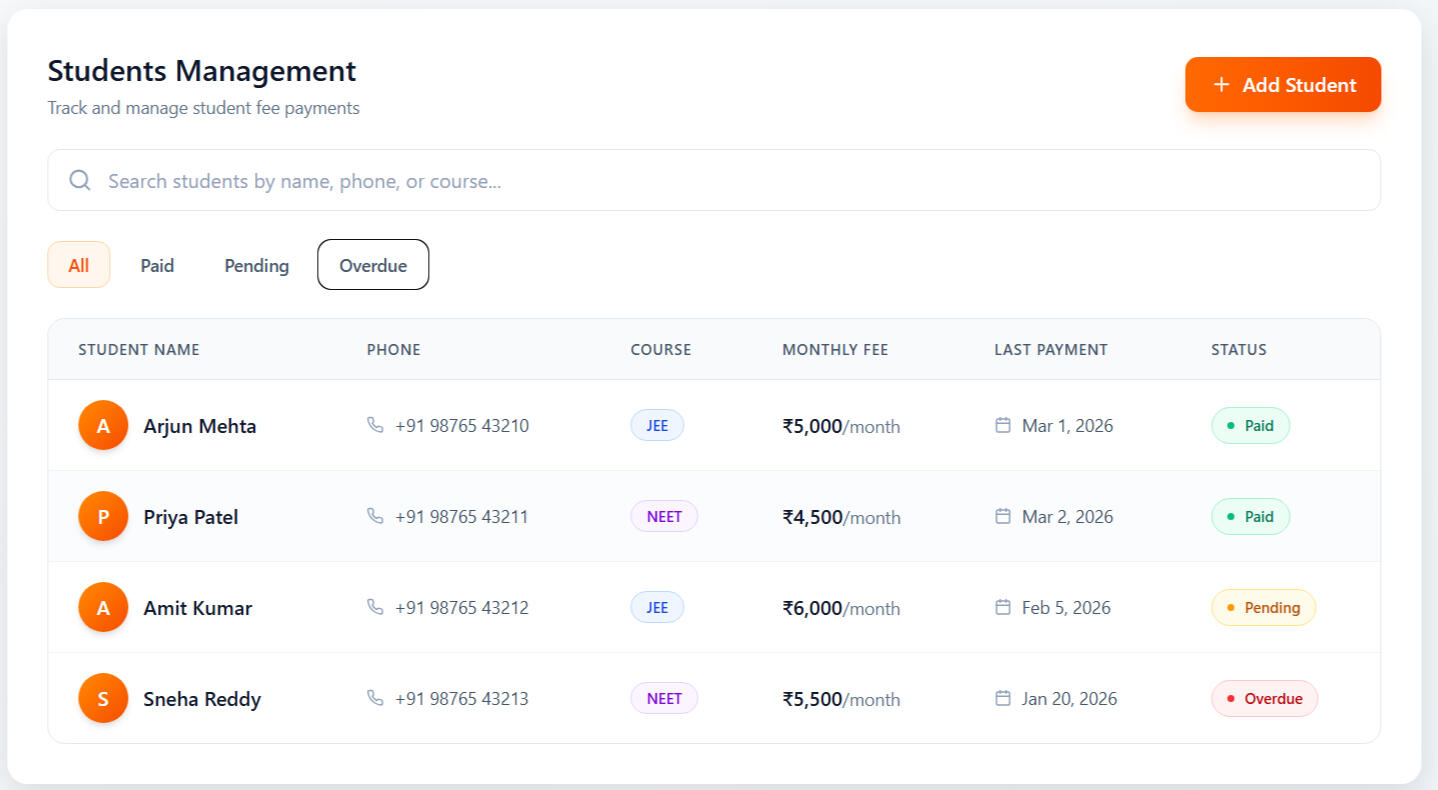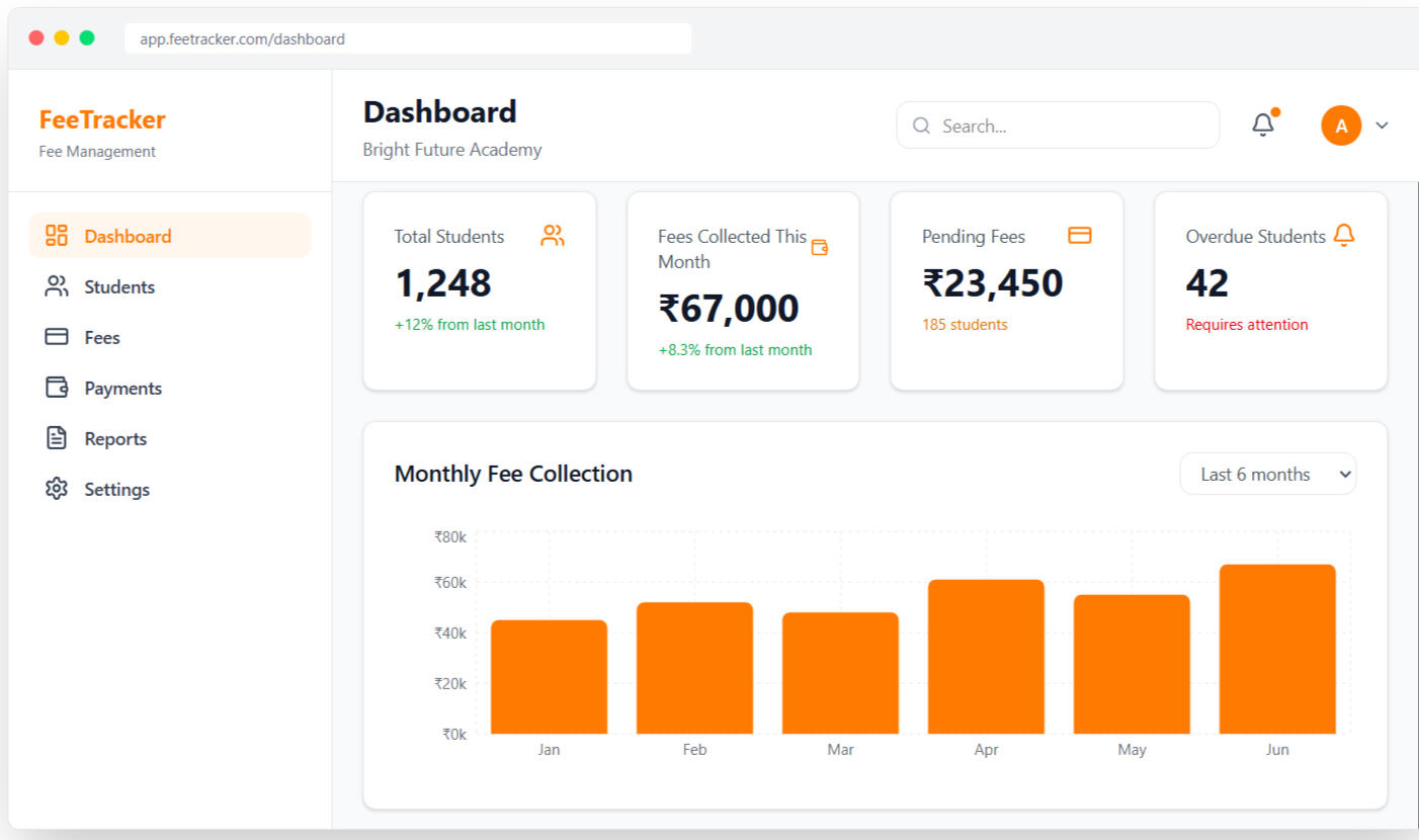 Track student fees, pending payments, and reminders in one simple dashboard.